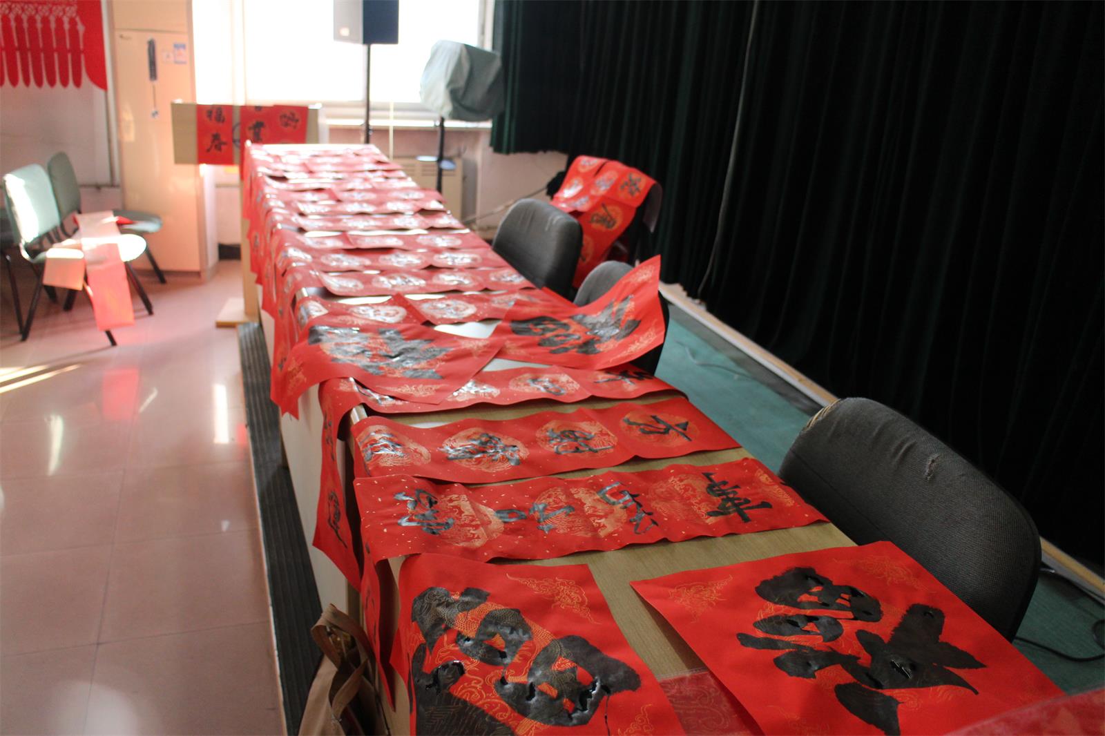 今年當然也不能例外!2月2 日下午15 點至 17 點30分,市書法家協(xié)會的多位優(yōu)秀書法家準時來到五樓會議室為本院職工們免費書寫春聯(lián),大伙兒熱情很高, 現(xiàn)場氣氛歡快,不一會兒各色字體,不同內(nèi)容的大紅春聯(lián)就鋪滿了各個角落。