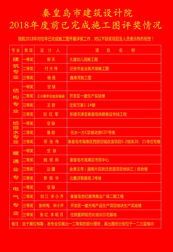 截止到201835日,活動最終按照各專業(yè)分別評選出了一、二、三等獎,評選結果和獲獎的優(yōu)秀施工圖分別在大堂進行了公示。